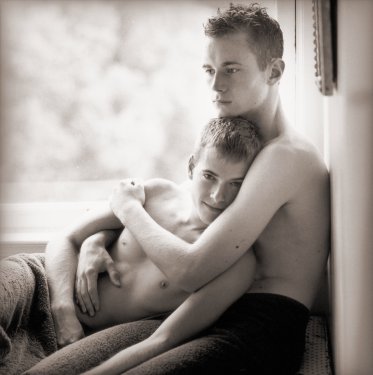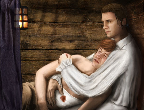 So, I set to it. Normally I start working on a picture because I have an idea—I want to make something specific, or, more often, a picture I find inspires me. By now, I have a collection of about 1.800 pictures for 'general reference'—when it comes down to it, that's Gay erotica and porn of different explicitness. They are split in three categories—one out of which I definitely want to make pictures, the smallest, then another folder with pictures I really like and think would also make a good picture, and a third, huge folder with the rest. Mind, I only save pictures of which I like at least a small bit, but I save those only for using a part of them, or perhaps when I need a specific situation, e.g. when I want to do an illustration. If a picture inspires me, I usually see a story to go with it. It need not be something big, just something that could give the impression that there is something going on that fits the characters. Likely the Coupling fans will now giggle at me, but I try to do erotica rather than porn. For me, the difference lies in intimacy. By that I do not mean cuddly schmoop (although I may draw it at times), but a personal level on that relationship. I try to make that tangible, and I believe having a "story" is the key to that. This is where the third, large category of reference pictures falls short—they are porn. Men, yes, even (some)pretty men, but nothing that gives them spirit. Now, the problem is that the pictures I sorted into my first category were rather Sparrington-specific. The story I see going with them is Sparrington, and it is not so easy, if not downright impossible for most to replace them with Gillington. And so, I searched again. ![]() This was the one I chose in the end. I knew I wanted to make them younger, James as a Lieutenant and Gillette as a Midshipman, perhaps. Also I was relieved that it would allow to show Gillette in a front to 3/4 view, because it is very difficult to get proper pictures of him from anything but the short scenes in POTC, and I can't improvise his facial features well. Also, he never quite has this look of quiet contentment I would have thought necessary for using this picture "as is". This was where the "plot" that struck me came in—Gillette being injured. I ended up using this shot: ![]() I didn't have much choice between other caps, so this was it. Ironically enough, as soon as I had adjusted the colours, done some smoothing and reshading and added the hair, I was quite content with his look. He was being most compliant in this picture, I only had to do very little re-editing while working on it. With James I had more choices, because I have plenty of caps of Jack Davenport in various movies and series, not to mention the possibility of making new ones. I ended up with this shot from The Moth: ![]() The strange thing was that once I resized *exactly* that face and gave it a forehead and hair, the nose and lips looked as though they were too big. ![]() I honestly don't know how much time I spent messing around with James' face. I know I annoyed all my poor online beta victims to no end. Not to forget that I *hate* drawing folds. Always did. Not to forget that they take ages, because I draw linen with a thin, one to two pixel brush. That is similar to drawing with the point of a pencil as opposed to its side, and creates a completely different texture which I quite like for linen. Also, I had to colour whatever I used from the original picture, then adjust lighting and hues of all the used elements—for James, that involved redrawing most of his face, and Gillette also needed more highlights and shadows than the original had. While most of my reference pictures are colour, the greater part of the "better" categories are black and white, usually because that is the format artistic photographers use. Mind, colouring itself usually is easy, getting the hues and lighting to correspond a lot more difficult. In this case, I started out with a generic lighting, because it is the easiest and more usual when there is sunlight involved. ![]() In this case cjk1701—the poor soul has the misfortune of often being online when I need help and being so very helpful that I keep asking—and I quickly realised that this generic lighting is not atmospheric in the least. Therefore, add lantern. ![]() Much, much better. The shippy background comes from this wood texture I edited to look more plank-like. ![]() I still wasn't quite satisfied with the head, neither was cjk1701, therefore, continued messing as well as some other minor changes, such as slightly different contrast and blending. ![]() This was when I pounced gryphons_lair for "betaing". She was being most helpful and gave me some great suggestions which eventually led to this, the final product: Brothers In Arms![]() Phew... I think that's it! Thanks again for everyone who helped me during the production of this!