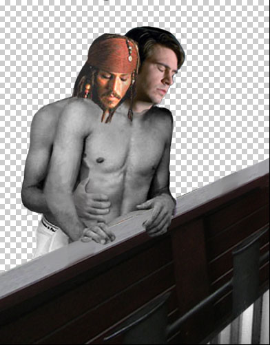This is the picture I chose this time. It was not on my current list of pictures with which I had planned to work, but it was one I saw and thought could work as a manip and still have a story I wanted to tell. When I looked at it, some weird part of my brain already inserted moonlight, a ship's railing and a mast in the background. That part of my brain is a very scary place, but one that all manippers should have and embrace. It is the key to not starting something that, no matter how good the execution, you won't like. This also entails the decision of who will be who. This can be determined by factors such as size, build, etc., but also by the role in the 'story'. For example, here I wanted Jack to be the one standing in the back, although clearly, James is the taller of the two. When selecting a picture, I usually immediately see who will be who.