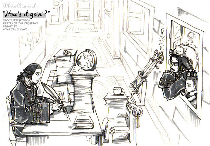 Disclaimer: Pirates of the Caribbean and such all property of Disney. Summary: Storytelling. "How's it goin'?" James looked up sharply from the desk. Admiral Sparrow was partially draped over the windowsill, one elbow hooked over the frame, fingers curled over an edge. The white cat clung somnolently to his head, like an exotically furred cap. Next to him was a flushed, breathless but impishly grinning Will Turner, dressed smartly if a little oddly in a hastily altered red coat of a marine, still a little too large for him. No hat—at least someone sensible had recognized that the inclusion of a far-too-big hat would have been far too absurd. One small hand was clamped on the sill, the other clutched Sparrow's hat to his chest. "Passably," James gestured with his quill at the desk and guest chair, which had been stacked neatly with three different columns of papers, some crisp and new, some blotched and stained with what looked suspiciously like tea. Hopefully was tea. "I've started on the acquisition forms and... Jesus, Admiral, this office is on the third floor!" After pulling Turner through the window, James reached out to grip Sparrow by his elbow to steady him as the other man pulled his slender frame through. A boot slipped, however, and there was a yelp—James staggered backwards with an armful of warm Admiral and outraged cat. Scents—tobacco, an odd lingering hint of rum, starch. Gunpowder. Unperturbed by how his Lieutenant seemed suddenly petrified in place, Sparrow pulled away, dusting himself off, taking the hat from Turner and displacing the cat from his head. It leaped down and ambled over to the chair James had just abruptly vacated, curling up with a soft purr. To give himself time to calm down from the adrenaline (which had, James would say, everything to do with seeing his commander and a child hanging from a third-story window, rather than anything to do with the effect of the accident), James stalked to the sill and looked down into what seemed to be a sheer drop to the courtyard. The midshipman Gillette, another midshipman—Groves, the name was, if he recalled—and a few other marines were glancing up with worried expressions, relaxing when they recognized him—Groves saluted, grinned, and wandered into the building. "What in the world did you think you were doing?" he fumed. "Not only did you endanger yourself, you compromised the safety of a child!" "Now, Lieutenant, is that any way t'speak t'yer Admiral?" Sparrow shook a finger under his nose, his expression archly disapproving. James' eyes narrowed. "Admiral Sparrow was teaching me the art of climbing," Turner said quickly, eyes darting between the Lieutenant, tense from anger and shock, and Sparrow, who seemed not the least repentant. "Important to being a marine." "An' I've done the climb lots of times. It's perfectly safe," Sparrow said, flapping a hand dismissively as he wandered over to the stacks of paper. "Eh. I don't think I've seen the surface of this table for years." James took a deep breath, then slowly let it out as he realized that Will, with the intuition of a child, was still peering at him worriedly. And was, in fact, edging slowly between him and the infuriating man currently sidling around the desk to see what he had been up to before the rude interruption. Protectively. It had only a week and a day or so since Sparrow had announced that, seeing as the Turner boy had been shipwrecked by pirates and was now without a family, he would be employed by the Navy as a page (a position that did not in fact exist and which James highly suspected that the Admiral had made up) up until his 18th birthday, wherein he would enter the Navy as a full Marine. A small room, previously used for storage, had even been cleared and refurbished in the barracks. Now the pup, and sometimes the impressionable Miss Swann, stuck like burrs to the Admiral almost wherever he went, and to James' dismay Sparrow made no move whatsoever to discourage them—nor even their innocent hero worship. Calm. He could be calm. James dipped his head for a moment, then walked over to his desk and picked up the cup of tea from where it had been acting as an interim paperweight, which he drained. The sweet, if now lukewarm beverage cleared his mind, and he even managed a wry grin at the boy, who relaxed. "Some of the forms specifically need your signature, sir." "Which ones?" Sparrow picked up the cat, deposited it in his lap and sprawled into the chair, twirling the quill deftly with his fingers. "That stack," James pointed at one of the mountainous if neat columns of paper, this one weighted down by a heavy bronze-framed model of the globe. The Admiral pouted. "Y'sure?" James looked down again, scowling, one hand on his hip, the other tapping a staccato on mahogany. "I'm sure. I've already filtered out the work that can be sorted out by a midshipman or myself. Some of these documents are... are ludicrously overdue. Sir." "Should really get me signature carved out onto a block so it can be stamped," the Admiral muttered, reaching up for the first document. "The point is to read the documents that specifically need your notice," James said patiently. "Aye, well, if 'tis so important, sure ye could do it," Sparrow said brightly, if illogically, though he scanned the document and signed in a flourish where indicated. "Will, lad, go get the Lieutenant an' meself some more tea. Cook knows how I like mine." The boy nodded, hesitated, glanced at James, threw a passable if unsteady salute, and left the room. "A few dispatches are confidential to you, sir," James continued inexorably. "I stacked those on top." Sparrow sighed, glancing up at James with a hangdog expression that seemed very out of place even in the more casual undress Admiral uniform—laced, instead of embroidered, with lapels, a bright red sash across the white and gold inner coat. He shifted the chair back, crossing boots atop the desk. "Yer going t'make sure I do all this w