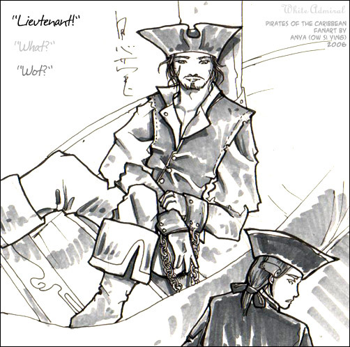 Note: I couldn't illustrate Sparrow for this chapter. Sorry. Summary: Hostage situations. "Lieutenant!" "What?" "Wot?" Marines and James alike stared in disbelief at the scallywag lounging in the battered sloop, who had echoed James' answer to Gillette's call. He had a face that had likely been a heartbreaker in his youth, now weathered by the sun and exposure, hair in a wild tangle under a lopsided tricorne hat. Gray vest and white shirt were discolored and patched, and bucket boots had a deep slash over one hem. Pistols and cutlass had been surrendered. Said scallywag was in irons—and absolutely unperturbed—he grinned when Gillette came to a huffing stop next to the small ship. "Aye, still midshipman? What 'bout Theo?" "Here, sir," Groves appeared at Gillette's shoulder, equally out of breath. "You know what the Admiral would do if he promoted us. We don't want to be reassigned." "Explain," James said sharply. The stress of the past week and a half was taking its toll. Months of patrols and raids on pirate strongholds had passed with only minor hitches. Sparrow had even (if grudgingly) begun to vet plans with James beforehand—though usually, all that James could contribute was to polish up rough edges. Privateers had been pushed back to Havana and Saint Clemens, to the point that Sparrow was actually beginning to feel a little bored, cruising about the open sea with nothing to do. No mention had been made from either side of the intimate moment on the apple tree. Then disaster had struck—a bad storm near Georgetown had separated Gillette's Assailant from the fleet, and it had been badly damaged. While attempting to find their bearings, a group of Spanish privateers had happened on the Navy ship. A very bloody ransom note had been delivered to Sparrow at Port Royal—James had watched dark eyes become icy with fury. His men, for himself. James had thought of seven men with broken necks in a pirate cell, and wondered if he'd ever see the midshipman alive again. Sparrow had been too quiet through the day—James felt that he really should have suspected something. The next day found the Admiral—and a sloop—conspicuously missing, and the fort had instantly been thrown into disarray. They had arrived at the coordinates provided in the note too late—despite taking the Pearl and the Interceptor. No Sparrow, no privateers—only the damaged Assailant and its shackled, beaten crew feverish from exposure. James wasn't even sure how Sparrow had made it to the area before the two fastest ships in the fleet, despite his head start. It had been a week and a half since then, and James' sleep was plagued with bad dreams of bloodied, barely-human heaps. Searches, a dragnet, and investigations in all possible ports of call had come up with nothing. He could tell that he wasn't the only one. Gillette and Groves looked exhausted—but they were all smiles at the sight of the lounging man in the small ship. Overwhelming relief. Groves took the keys to the shackles from James, and unlocked the man's wrists. "Sorry about that, sir." "S'all right. An' since I've more or less already blown me cover, ye might as well introduce me." Gillette turned to James. "Lieutenant Norrington, meet Lieutenant 'Bootstrap' Turner. One of the Caribbean's best kept secrets, and the source of much of the confidential information about piratical movements about these parts. Last seen as a pirate officer in Captain Barbossa's crew..." "What?" James' voice rose. There were gasps from observing marines. Then he recalled Sparrow having mentioned, a while ago, something about having three lieutenants. A story for another day... Sparrow always seemed to know, uncannily, what his opponents planned. Where they were, where they were based, how they could be supplying themselves, where they would strike next. It wasn't perfect, and he'd seen some misjudgments (though all quickly circumvented with quick wit), but otherwise, everybody seemed to have attributed it to luck. Divine providence. It did wonders for morale—sometimes James even found the effect on the men frightening. If ever ordered by the Admiral to steer their ships into gutting reefs, they would likely have done so without hesitation. Outside lieutenants. Then this? 'Bootstrap' Turner. He knew a Turner... "Oh, yer the Pirate Hunter, eh? Ye've been makin' a name for yerself around the pirates. Pleased t'meet ye," Turner said cheerfully. "I'd shake yer hand in a mo'." "We're really glad to see you, sir, but..." Gillette's voice trailed off. "You just left? Like that?" "Can't bloody stay put now, can I, when I heard wot happened?" Turner had climbed up onto the docks. "They be holding an auction for Jack in Tortuga in a month or so. Open for biddin', any corsair that cares t'get his hands on the Luck of God. Barbossa had sent me to go check for authenticity, but word 'bout these parts was that the Navy be in a right panic. So I didn't bother t'waste time. Jack would be right pissed wi' me when he finds out I've blown me cover, but I set Jim up t'take me place..." Turner blinked slowly, and staggered back, when he saw a wide-eyed Will step forward from behind James. "William?" Will froze for a moment, then fled, towards the fort. Gillette put a hand on Turner's shoulder to steady him, but the Lieutenant shrugged it off. "He's supposed t'be in London! Where's Selene? Don't tell me she's here!" "Sorry, sir." Groves said quietly. Turner looked searchingly at their faces, then abruptly sat down, on the docks. "Ah." A deep sigh, and long, measured breaths, his shoulders trembling, then his jaw firmed. Quiet now, all his previous sense of amusement at the situation leeched away. "Suppose I should sort that mess out later. Most importantly, we'd best all be getting t'Tortuga."