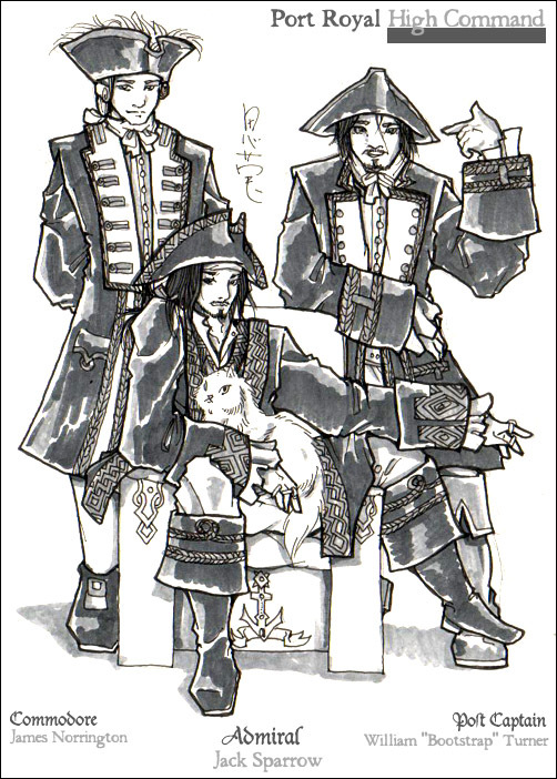 Okay, this AU turned out far, far longer than it was supposed to. T_t Self-control issue. Somehow, it managed to push 4 chapters past the expected limit without even having a decent amount of plot. :O I have learned not to try and restrict myself regarding future plans in final notes—since it never seems to work out. O_oa What will I do next? Since there appears to be a general terrible lack of Collared!Norrington fics, I think I'd play with that theme for a while... Anyway, here's a final bit of extra 'fic for "High Command": "Jack, we are not putting that up in the hall." "Why?" "I like it." "You stay out of this, Turner. It's too... too... informal." "Aye, well, I told the artist t'make it so, didn't I?" "That he did." "And you didn't stop the Admiral?" "Well... thought it'd be more fun, Norrington. More interestin'." "..." "...get angry often, does he? At ye." "...ye have no idea, mate. Get somebody t'put the portrait up in the hall." "What about Norrington?" "He's just gone off t'sulk for a bit. Seein' as that's me responsibility t'make things up t'him... Bootstrap, why don't ye take care of me schedule for the rest of the day?" "Even the meetings?" "Especially the meetings. An' make sure Gillette and Groves are too busy t'come look for me for anythin', savvy?" "Yes, sir." "Good. Heh. I'd be off, now."